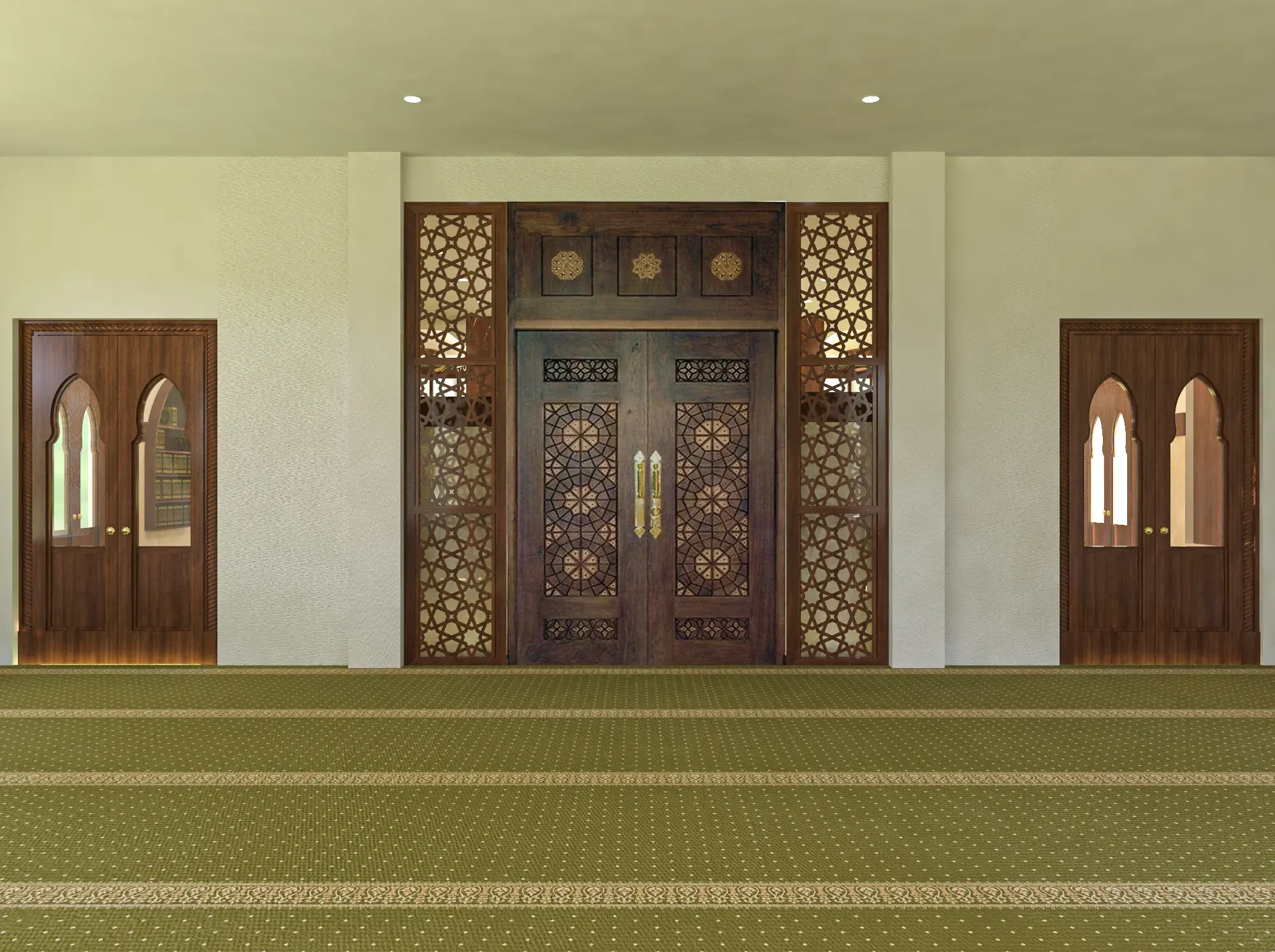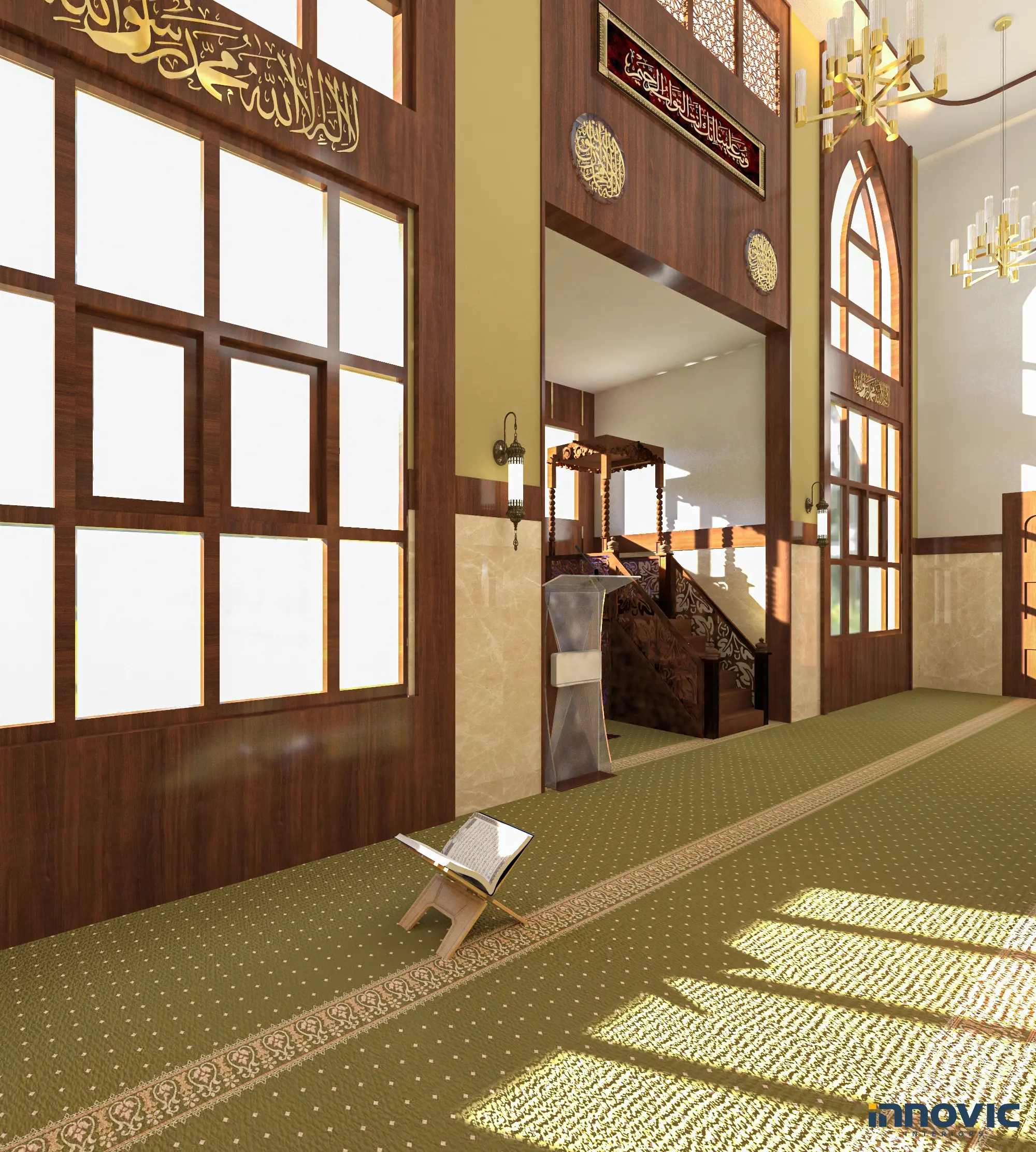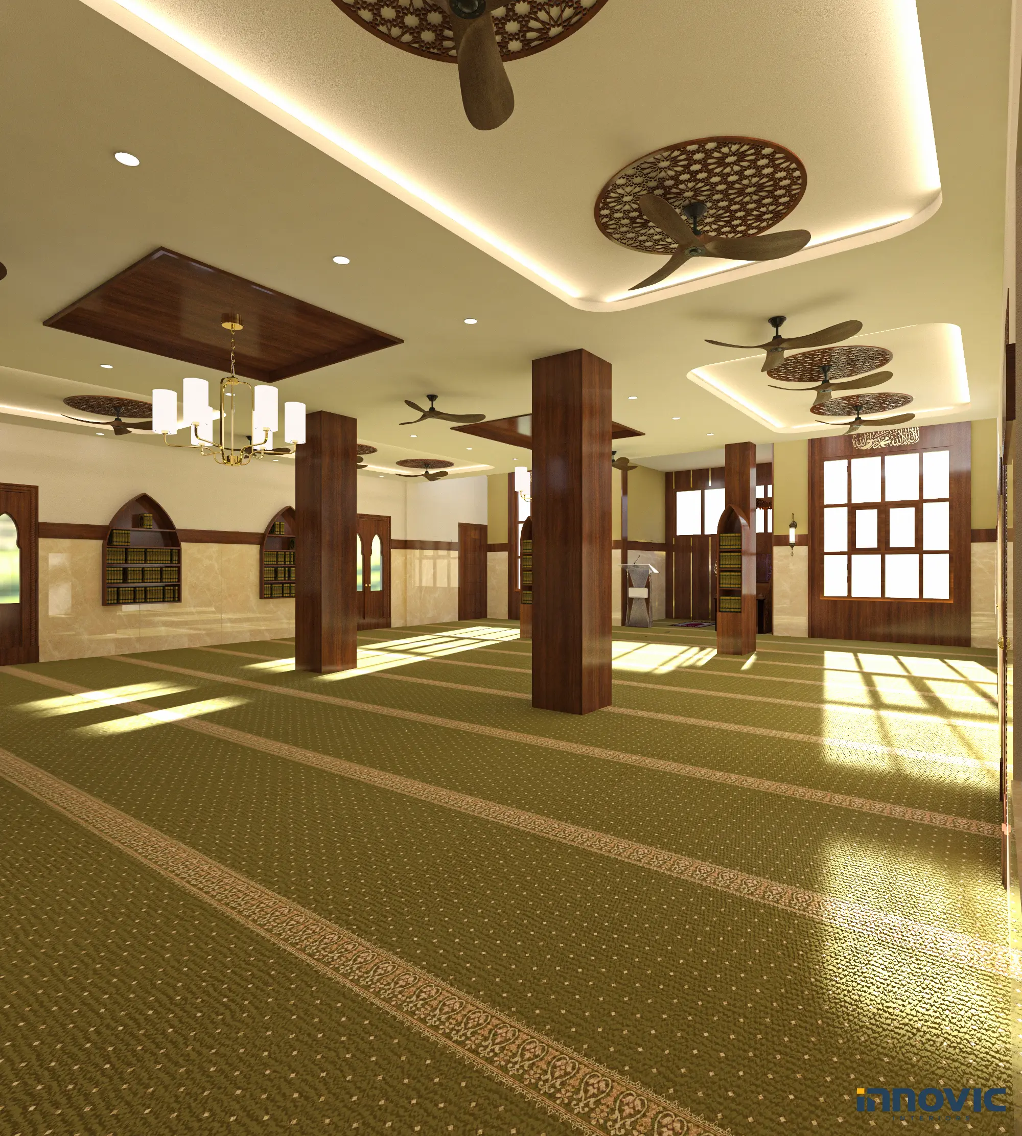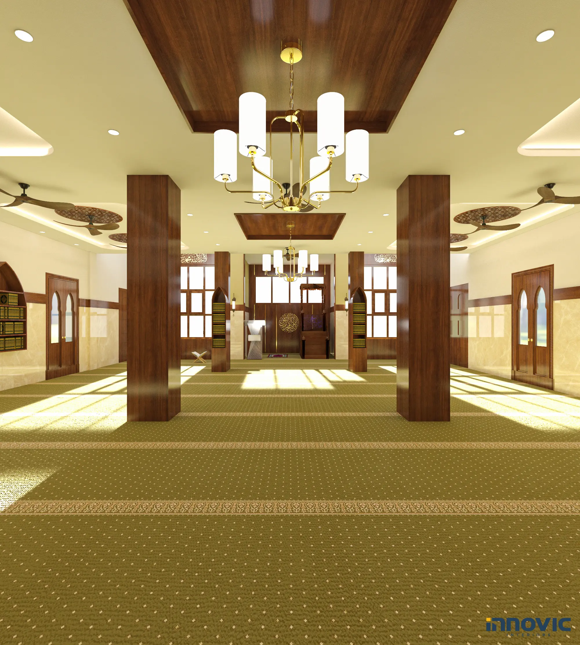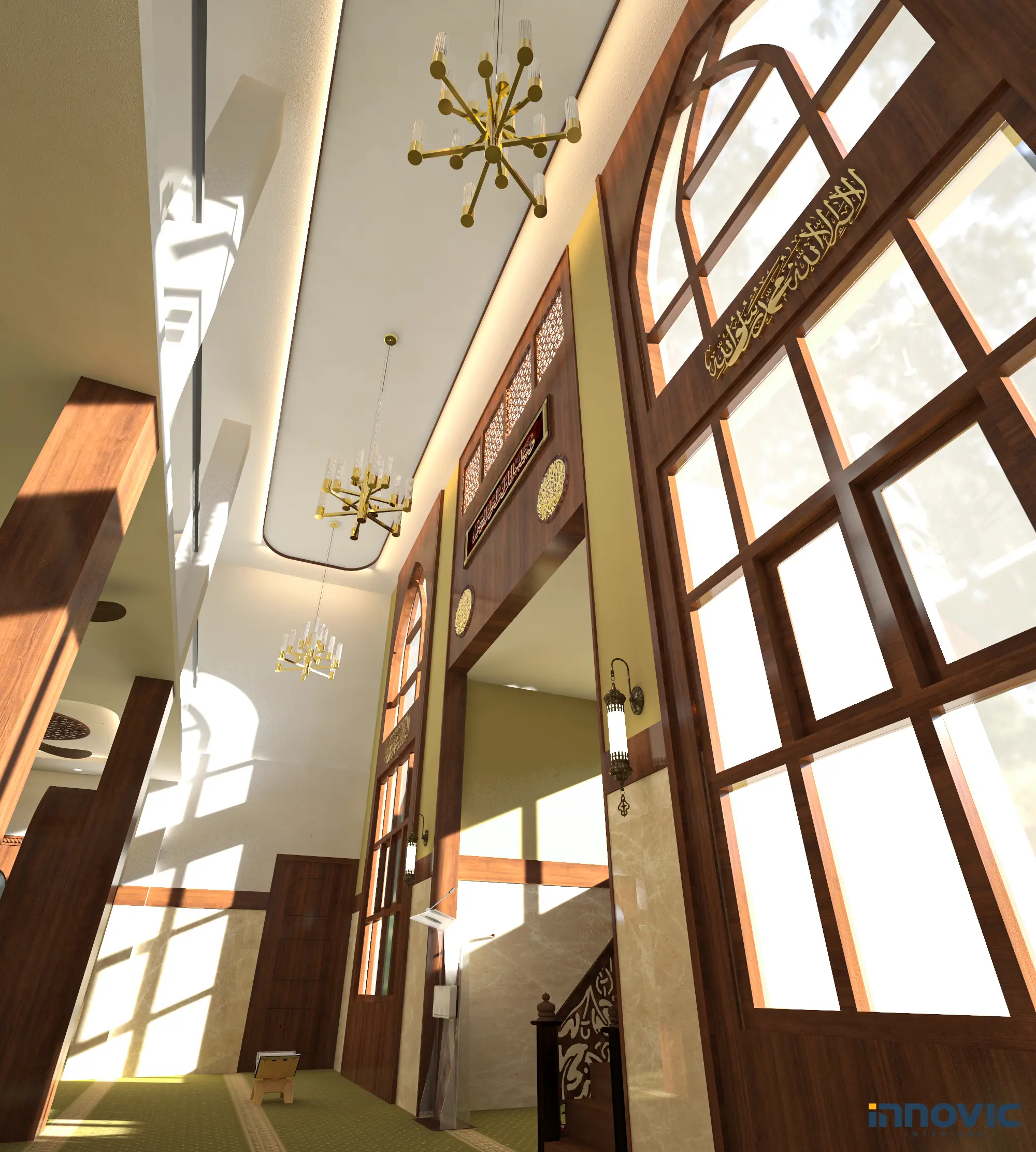 combines traditional Islamic elements with modern aesthetics. Warm wooden accents, intricate patterns, and ambient lighting create a serene and inviting space for worshippers, balancing beauty and functionality.